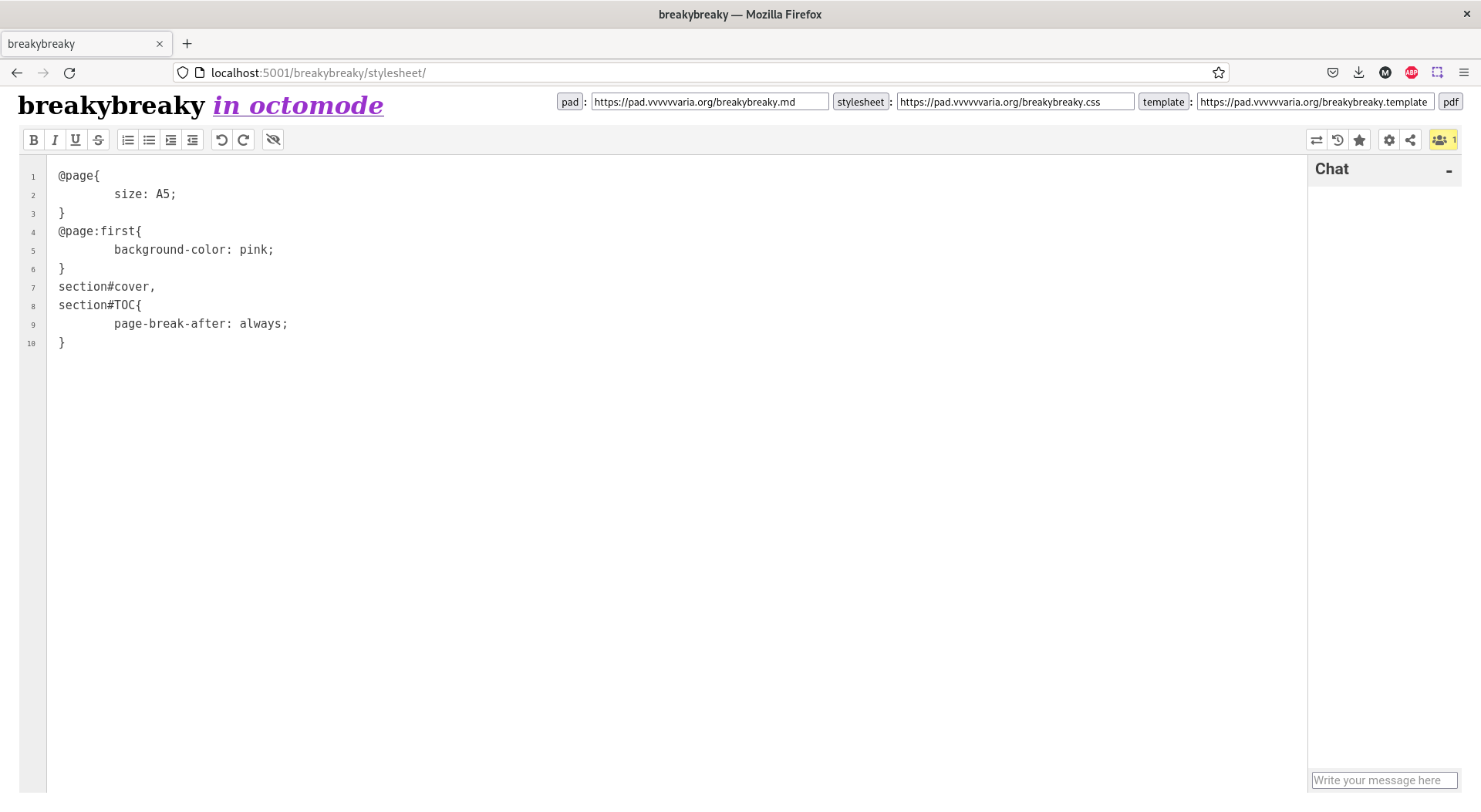 http://pad.vvvvvvaria.org/NAME.md. - another pad is created for writing the stylesheet of your PDF. The name of the octomode environment will become the name of this pad, followed by .css. For example: